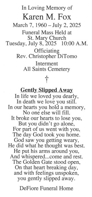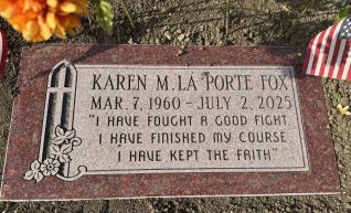 Karen M. Fox was born on March 7th, 1960 and She was the daughter of Victor and Eileen (Garrity) LaPorte.